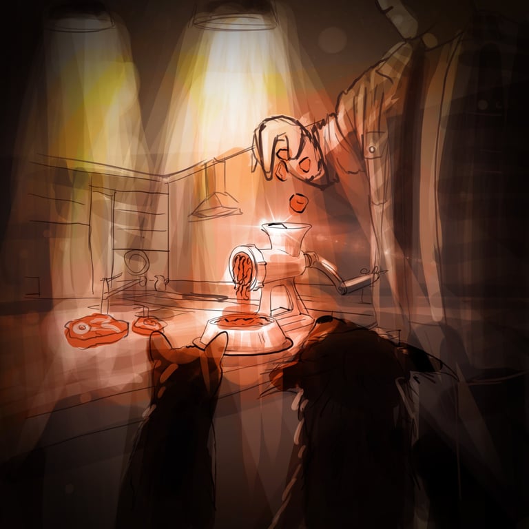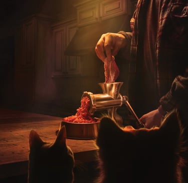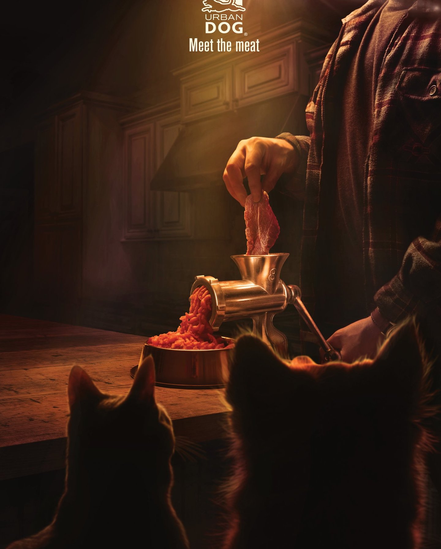 100% animal protein dog food . this was the brief . So i thought " okay" and after the first art direction sketch, the client said " yes, it looks like 100% animal protein" and we ended up with this after borrowing a few lovely pets and a few hours of photoshop :